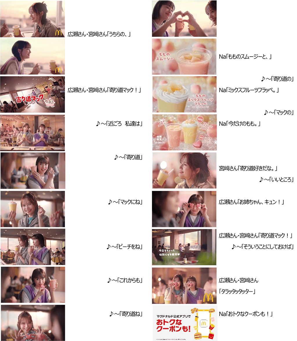 さらに、5月27日(火)から放映予定の新TVCMでは、McCaféのアンバサダーを務める広瀬すずさんと宮﨑あおいさんが姉妹役として再び登場します。PUFFYの名曲「これが私の生きる道」のご本人歌唱の替え歌に乗せ、期間限定のももシリーズを夕方に“寄り道マック♡”して楽しむお二人の仲睦まじい様子にぜひご注目ください。また、Xキャンペーンなどもご用意しておりますので、あわせてお楽しみください。(詳細は下記を参照)