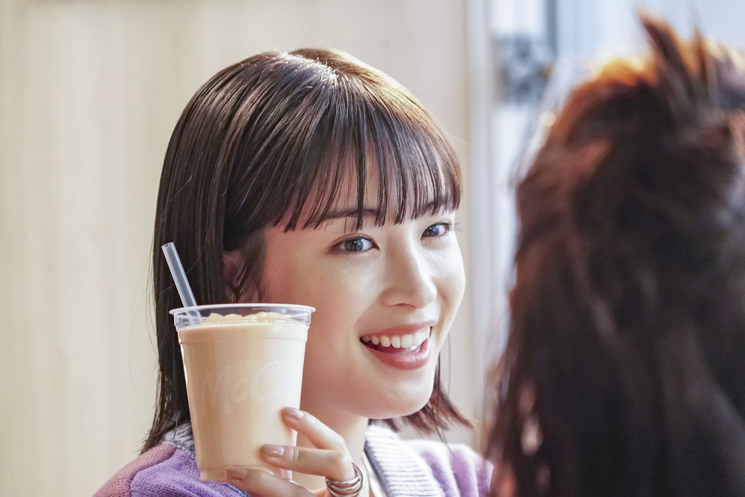 ももが大好きで、初夏の季節になるとマックカフェ®で人気の限定メニュー「もものスムージー」の登場を楽しみにしているという広瀬さん。この日はCM撮影のためひと足早く味わえることもあり、撮影用の商品を受け取るとご機嫌な表情を見せていました。マクドナルド店舗のカウンター席で宮﨑さんと並び、身体を揺らしながら歌うシーンでも「近ごろ私たちは~♪」と楽しそうに声を出していましたが、「ピーチをね♪」と歌う場面で思わぬNGが…。広瀬さんは前作のCM撮影で歌った歌詞の印象が強かったようで「前回の歌詞で歌っちゃいました(笑)」と照れくさそうに笑っていました。