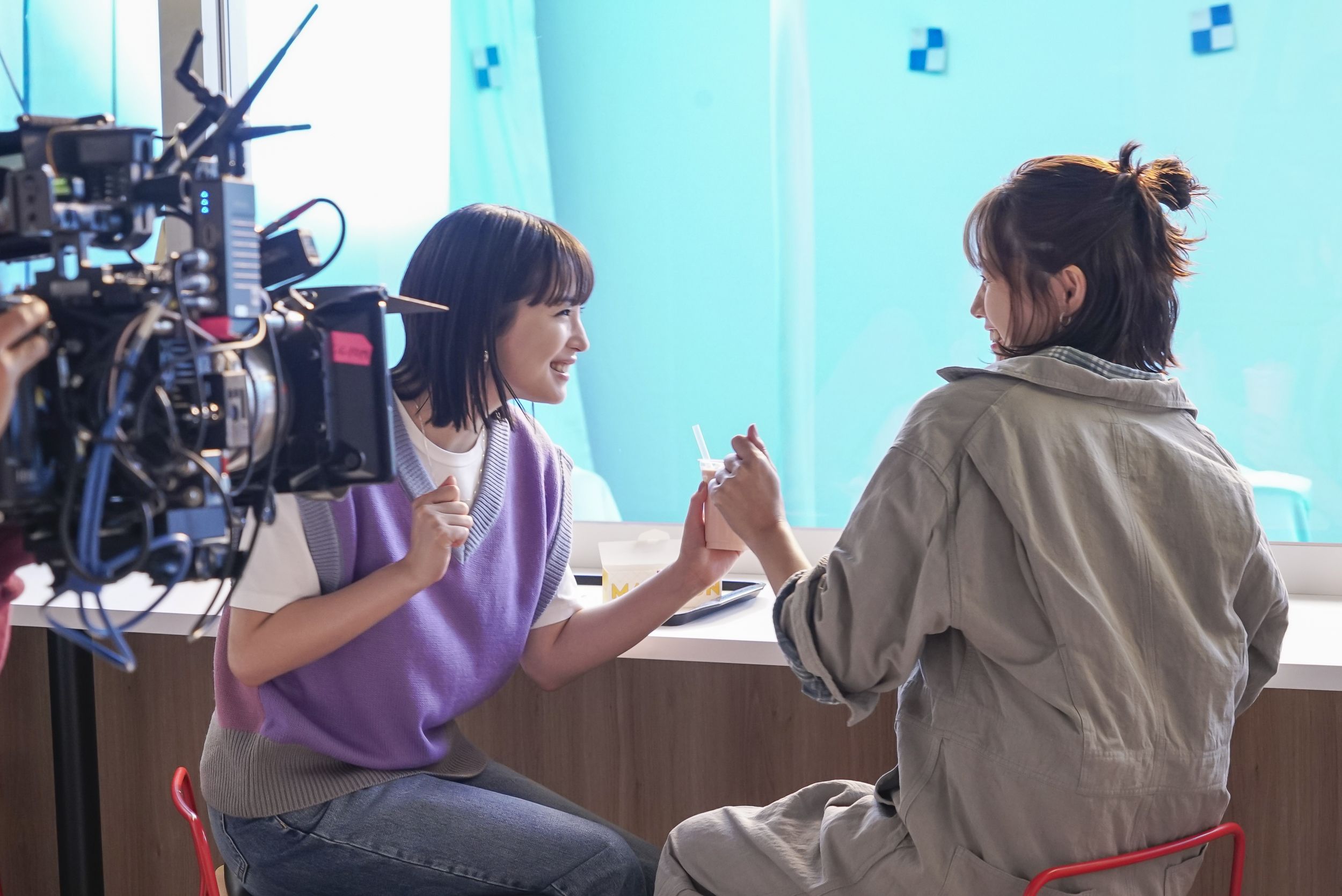4月に放送を開始した寄り道マックTVCMに引き続き、第2弾でも姉妹役を演じることになった宮﨑あおいさんと広瀬すずさん。今回もスタンバイ中から和気あいあいと談笑する姿が見られるなどリラックスした表情が印象的でした。姉妹で仲よく歌いながらドライブを楽しんだ前作同様、新TVCMも歌いながらカフェタイムをエンジョイする“ノリ”のよさがポイントになると監督から説明を受け、宮﨑さんと広瀬さんはリハーサル前から声を合わせて「近ごろ私たちは寄り道~♪」と歌や振り付けの練習に励み、満面の笑顔と高めのテンションで撮影本番に臨んでいました。