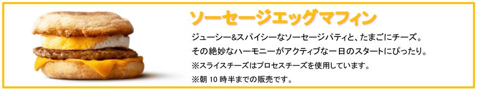 | ソーセージエッグマフィン | 330円~ | 530円~ コンビ 380円~ |
