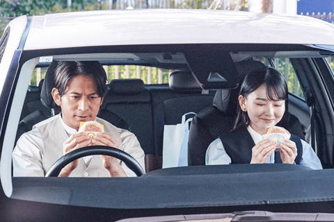 仲よく「朝マックタイム」を楽しむ“食べカット”の撮影も車内で行われました。昨年までは「朝マック」を食べる山田さんを岡田さんが羨ましそうに目撃する物語であったため、岡田さんも「前は『その手があったか』みたいな感じで壁を隔てていたけど、3年経って上司と部下の設定も変わってきましたね」と振り返るひと幕も。山田さんも、初期のストーリーにはなかった活発なコミュニケーションで「かなり仲のいい上司と部下の設定なのでその雰囲気が出るように演じたい」と意気込み、岡田さんは「ソーセージエッグマフィン」、山田さんは「チキンマックマフィン」を、おいしそうに頬張りました。