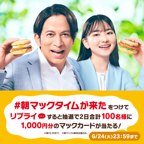 そんな「朝マック」の魅力をお伝えするTVCMシリーズは、岡田准一さんと山田杏奈さんが6度目の共演で「朝マックタ~イム」をお伝えする新作となります。早すぎた外回りは、逆にチャンス!?「キタキタキター!」と、車内で朝マックを満喫し、朝からアゲていく岡田さんと山田さんですが、山田さんの持つ「チキンマックマフィン」に「朝チキン!?」と驚く岡田さん。仲良く朝マックを楽しむお二人の姿にぜひご注目ください。また、Xキャンペーンなど各種施策もご用意しておりますので、あわせてお楽しみください。(詳細は下記を参照)