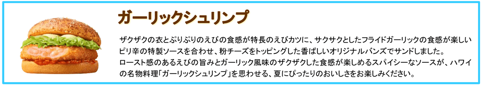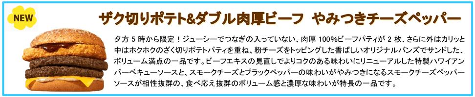 ハワイの定番料理をイメージした商品「ハワイアンバーガーズ」は、マクドナルドの夏を代表する定番商品として、毎年お客様にご好評いただいております。新しく登場する「ザク切りポテト&肉厚ビーフ やみつきチーズペッパー」は、肉厚ビーフにポテトパティを重ね、バーベキューソースとペッパーの効いたスモークチーズソースを合わせた食べ応え抜群の一品となっており、今年は夕方5時からの夜マック限定で、肉厚ビーフパティが2枚入ったボリュームたっぷりの「ザク切りポテト&ダブル肉厚ビーフ やみつきチーズペッパー」も登場します。また、特製ハワイアンバーベキューソースのビーフエキスを増量し、よりコクのある味わいにリニューアルした「肉厚ビーフチーズロコモコ」や、定番の「ガーリックシュリンプ」も登場します。