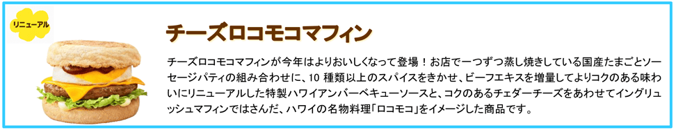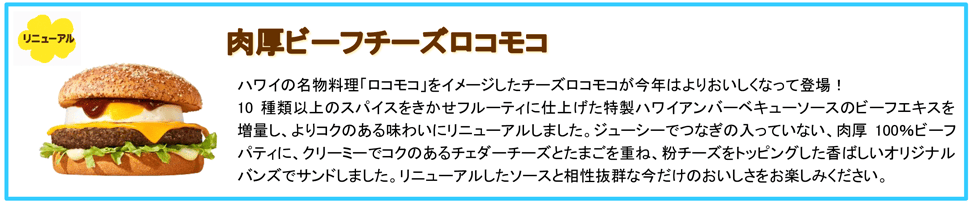 毎年お客様にご好評いただいている、マクドナルドの夏を代表する定番商品“肉厚ビーフチーズロコモコ”をさらに進化させるため、ビーフやチキンのうま味に10種類以上のスパイスをきかせながらもフルーティな味わいが特長のハワイアンバーベキューソースをリニューアルいたしました!