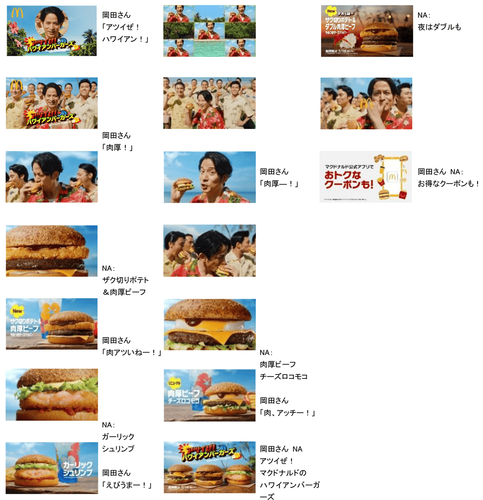続いて、夕方5時から提供される「ザク切りポテト&ダブル肉厚ビーフ やみつきチーズペッパー」の撮影では、美術セットが夕闇に包まれたハワイの情景へと一変。三角松明(飾り火)が灯され、辺りは次第に幻想的な空気に包まれていきました。「夜のハワイは…」という岡田さんの掛け声に続いて、「♪アツアツアツアツ 肉厚~」の歌が流れ、再び岡田さんが「ダブル!!」と叫ぶシーンでは、色々なカットを撮ってみたいという監督のリクエストがあり、「英語っぽくお願いします」という指示も。急な無茶ぶりにもかかわらず、テンポよくノリノリで応じる岡田さんの姿が、現場の雰囲気を一層盛り上げていました。