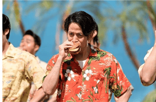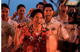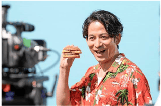 青い空と海が描かれた背景素材の前に、アロハシャツ姿を着こなして颯爽と現れた岡田さんとサブキャストたち。見るからに“アツイ”メンバーが横一列に並び、「♪アツアツアツアツ」「肉厚!!」と紹介するシーンから、撮影がスタートしました。岡田さん自ら、演技のシンクロ感にこだわり、楽曲「ふたりの愛ランド」のメロディーに合わせて、紙袋から嬉しそうにバーガーを取り出すシーンは、岡田さんの類まれなリーダーシップも相まって、瞬く間にOKテイクを獲得しました。