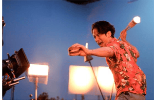 岡田さんが左手に松明、右手にバーガーを持ちながら、ファイアダンスを思わせる軽快な動きを見せる場面。さっそく左手の松明を器用にくるくると回し始めて、見る間にその場の空気を掌握した岡田さんを中心に、クレーンカメラを使ってさまざまなアングルから撮影しました。突然カメラに向かってカッと目を見開き、「ワハハハハッ!」と大声を上げたり、顔の近くに持ってきた炎の明かりで、バーガーを食べようと口を大きく開けたり、豪快なアクションを連発した岡田さん。即興とは思えない、岡田さんの遊び心と豊かな表現力が光る完成度の高いお芝居となりました。
