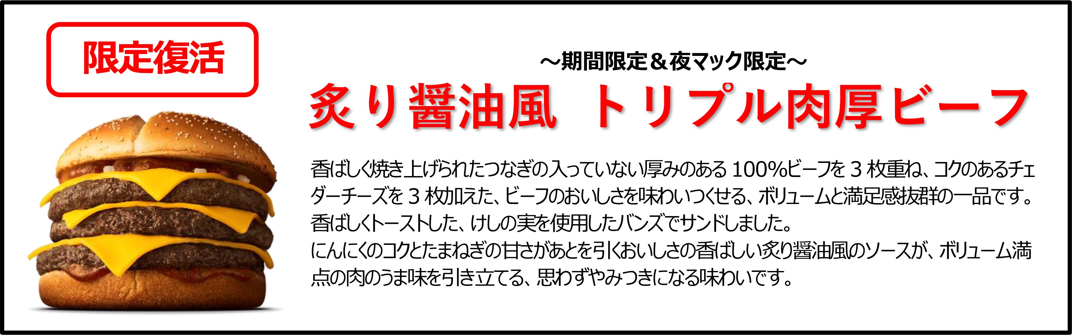 これまで期間限定販売が終了するたび、SNSを中心に、販売期間の延長や復活を望む声が多く聞かれるなど、大変ご好評いただきました。今回もその熱いご要望にお応えし、さらに夏の暑さに負けず乗り切る“パワー”をお届けすべく、夕方5時からの夜マックにて2週間の期間限定で復活することとなりました。ボリューム満点な「炙り醤油風 トリプル肉厚ビーフ」で、満足感のあるディナーメニューをお楽しみください。