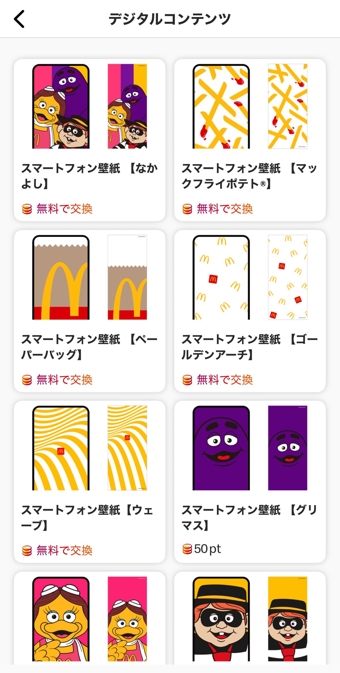 オリジナルの壁紙など、マクドナルドならではの“ここだけ”のデジタルアイテムです。ちょっとした楽しみとして、少額のポイントから手軽に交換可能です。