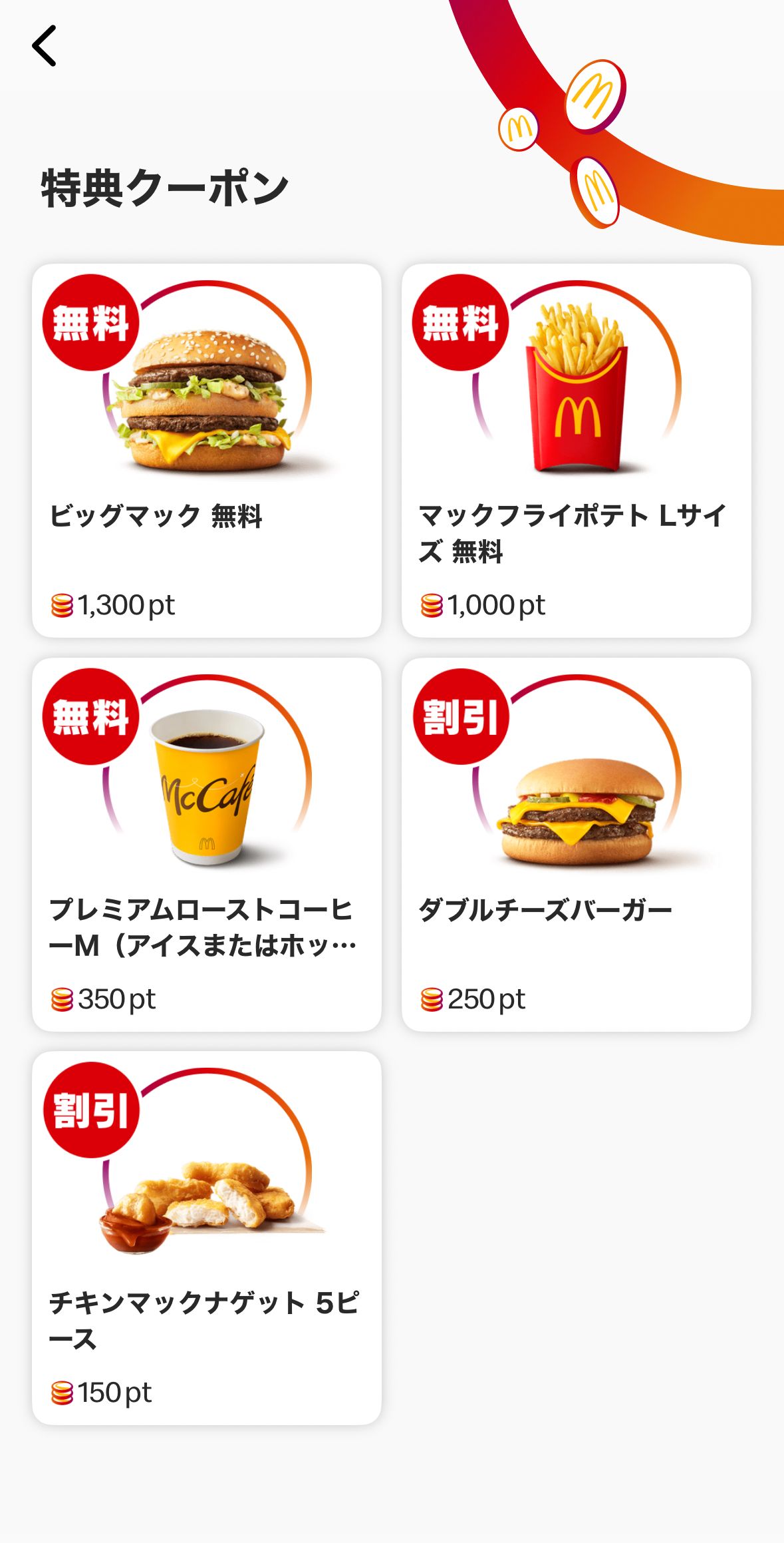人気のマクドナルドメニューをお得に楽しめるモバイルオーダー限定の「割引クーポン」や「無料クーポン」です。様々なシーンに応じて、手軽に使えるクーポンが揃っており、貯まったポイントの幅広い使い方が可能です。