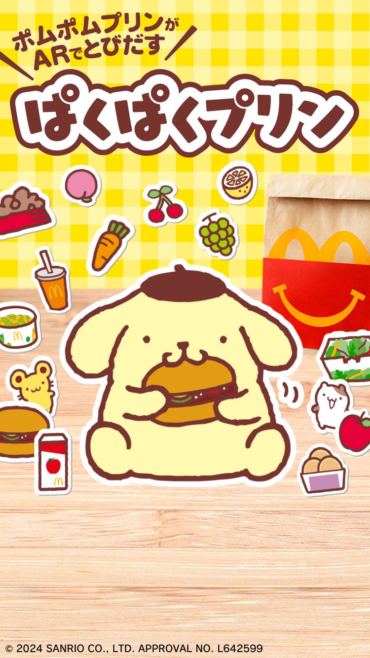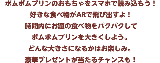 ポムポムプリンのおもちゃをスマホで読み込もう!好きな食べ物がARで飛び出すよ!時間内にお題の食べ物をパクパクしてポムポムプリンを大きくしよう。どんな大きさになるかはお楽しみ。豪華プレゼントが当たるチャンスも!