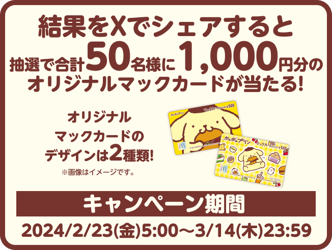 結果をXでシェアすると抽選で合計50名様に1,000円分のオリジナルマックカードが当たる! オリジナルマックカードのデザインは2種類! キャンペーン期間:2024/2/23(金)5:00〜3/14(木)23:59