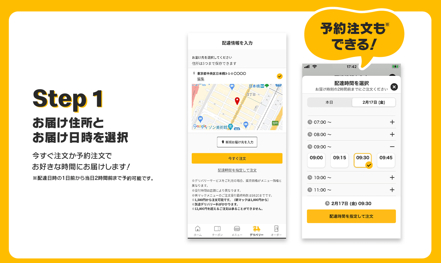 宅配エリアとその他の詳細:各社のアプリまたはウェブサイトからご確認ください。
