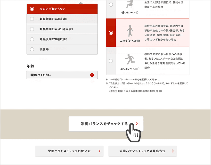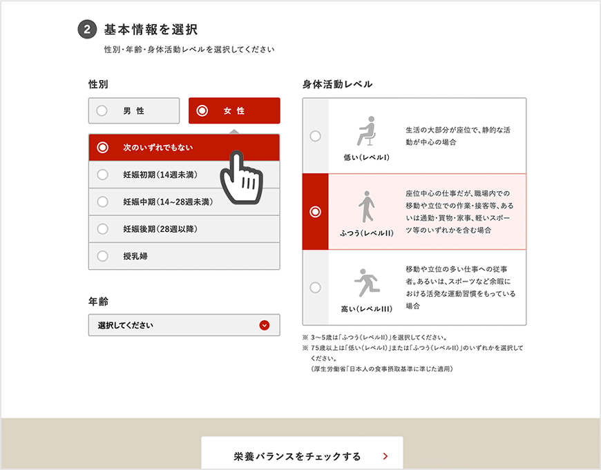 性別・年齢・身体活動レベル(カテゴリー)を選択します。
