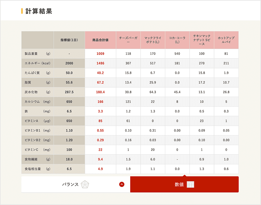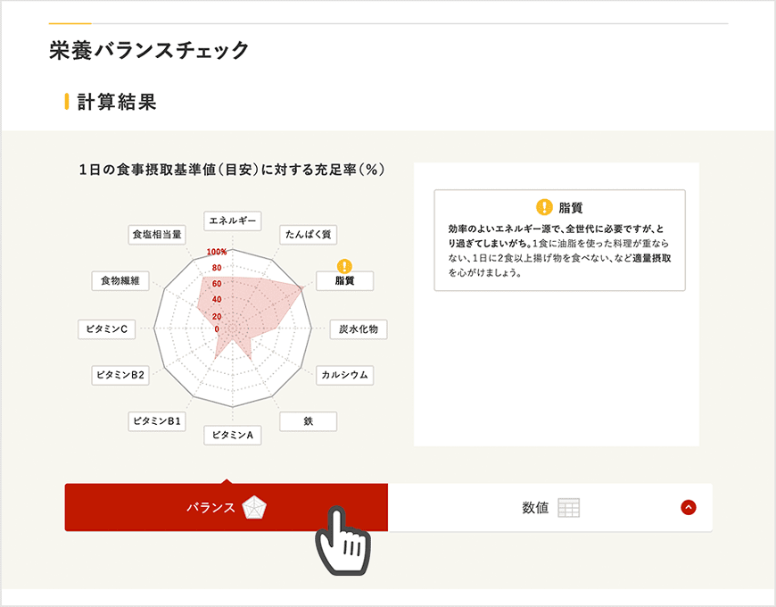 「バランス」では、1日の食事摂取基準(目安)に対し、選択した商品がどれだけ補えるか(充足率)が表示されます。