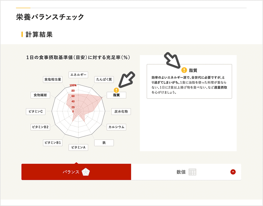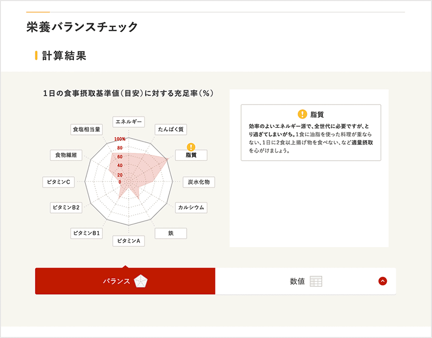 「栄養バランスをチェックする」を押すと、計算結果が表示されます。