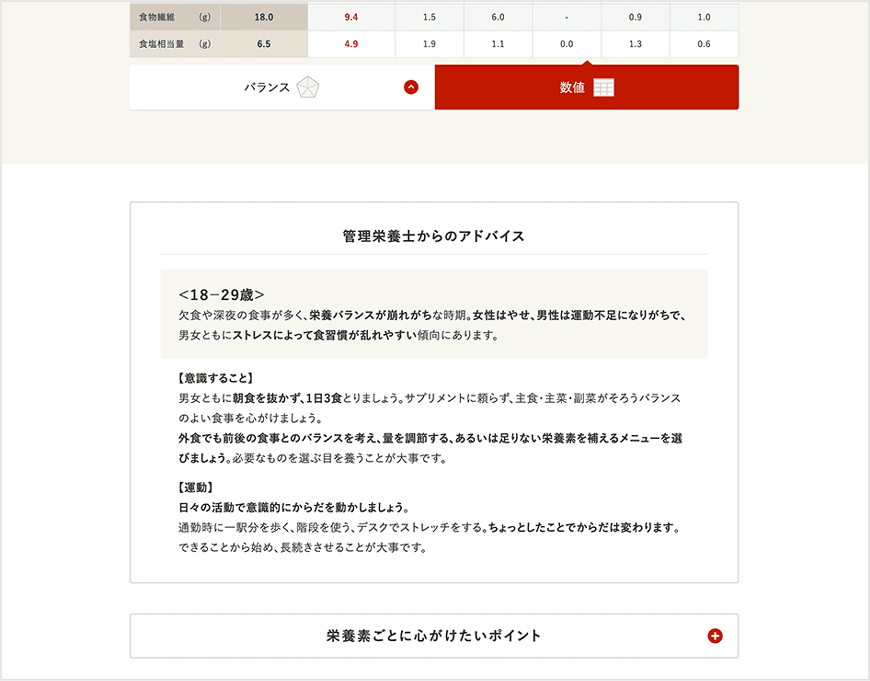 管理栄養士による年代別アドバイスや栄養素の説明も提供しておりますので、食事の栄養バランスを考えるうえでも、ぜひご活用ください。
