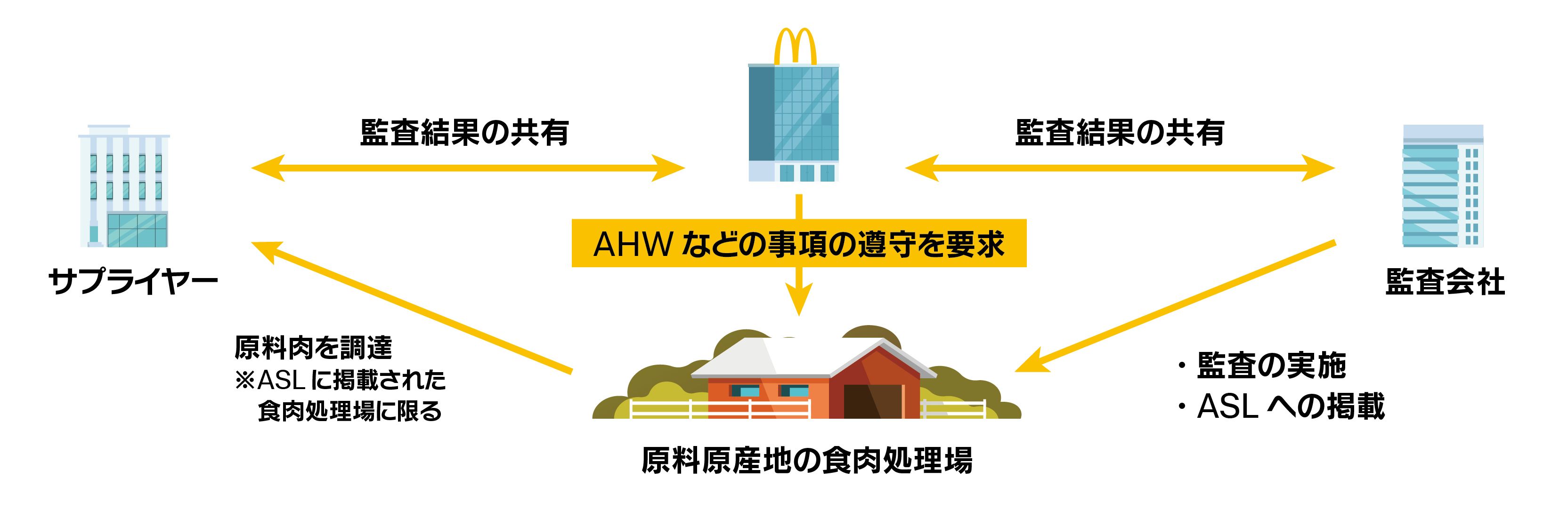 マクドナルドは原料原産地の食肉処理場に対してAnimal Health & Welfare(AHW)に関する要求事項を遵守するよう求めています。