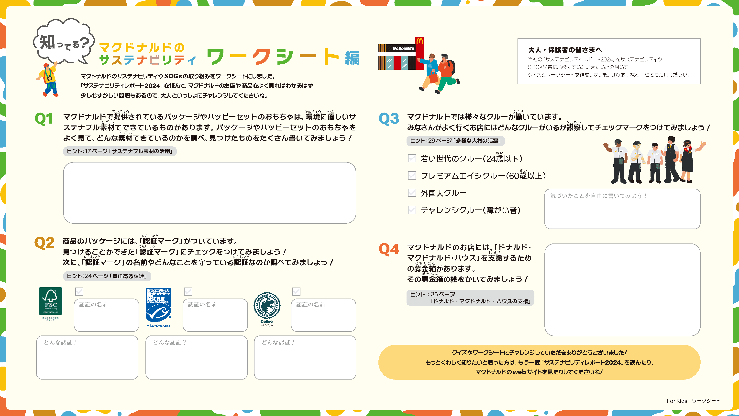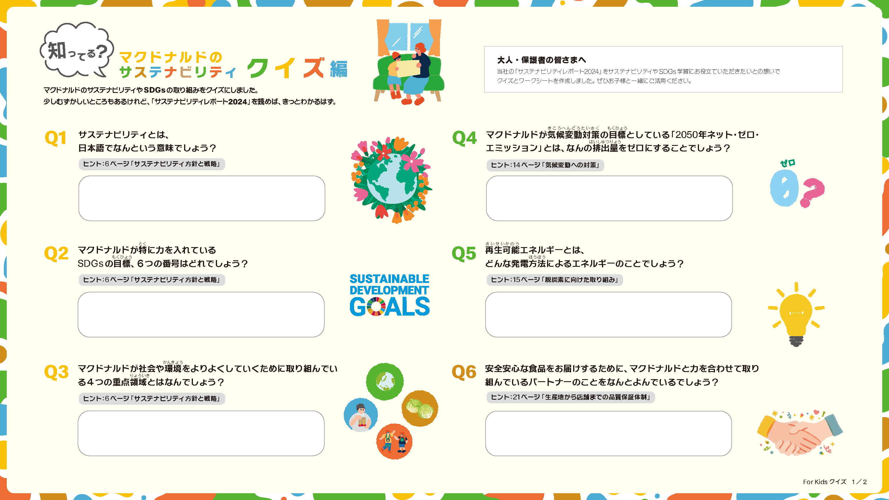 SDGs学習に役立つクイズとワークシートです。環境や社会のために、マクドナルドはどんな取り組みをしているか、調べてみてくださいね。
