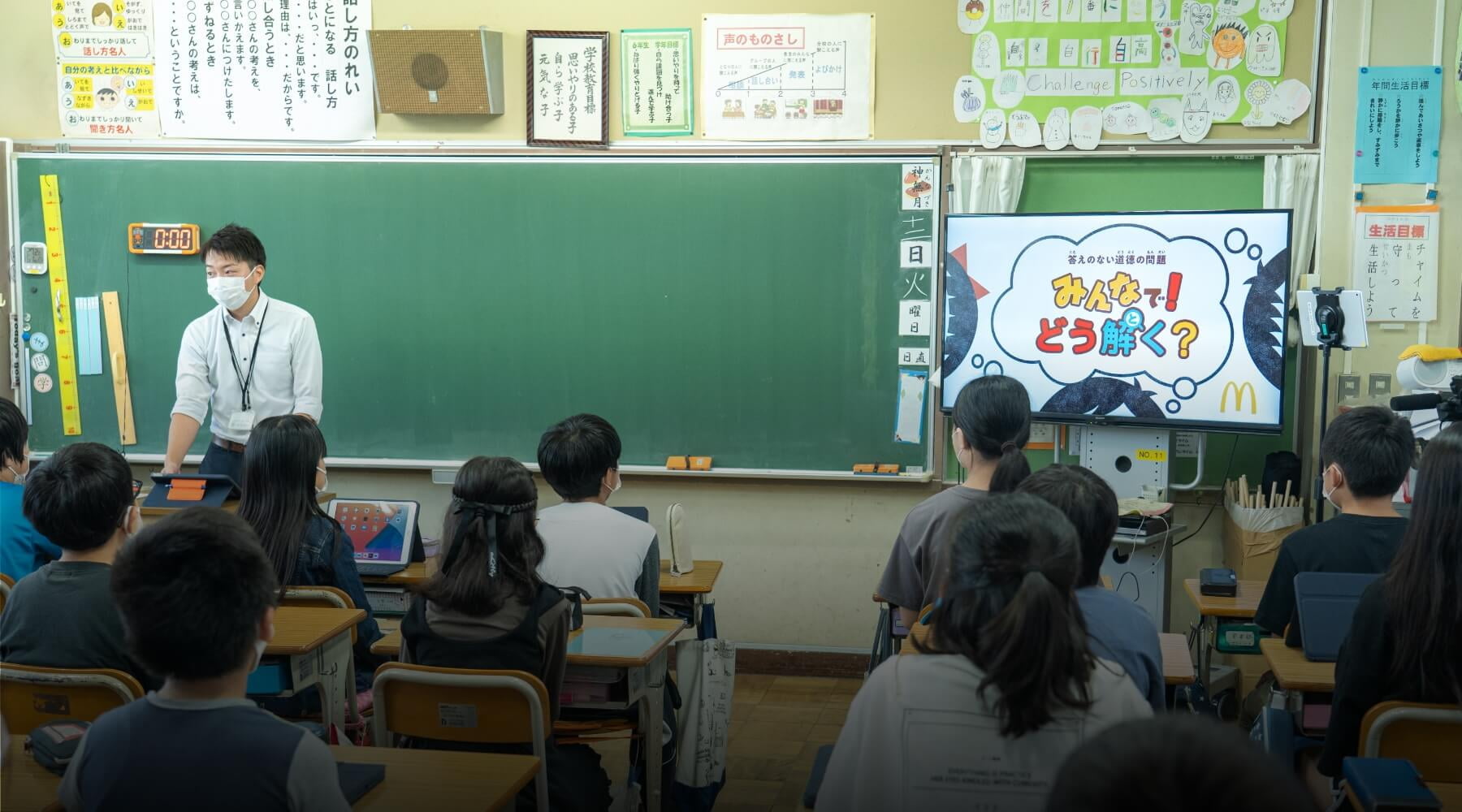 「どうして正義のヒーローは悪者を殴って良いんだろう?」この日授業を担当した皆川先生は、3年前に出版されたポプラ社の絵本「どう解く?」に書かれたこの問題を読んで、「答えのない問題」に子供たちと一緒に向き合うことに興味を抱いたと言う。そんな中、校長先生から「みんなで!どう解く?」の教材化の話を聞き、授業の実施に手を挙げた。