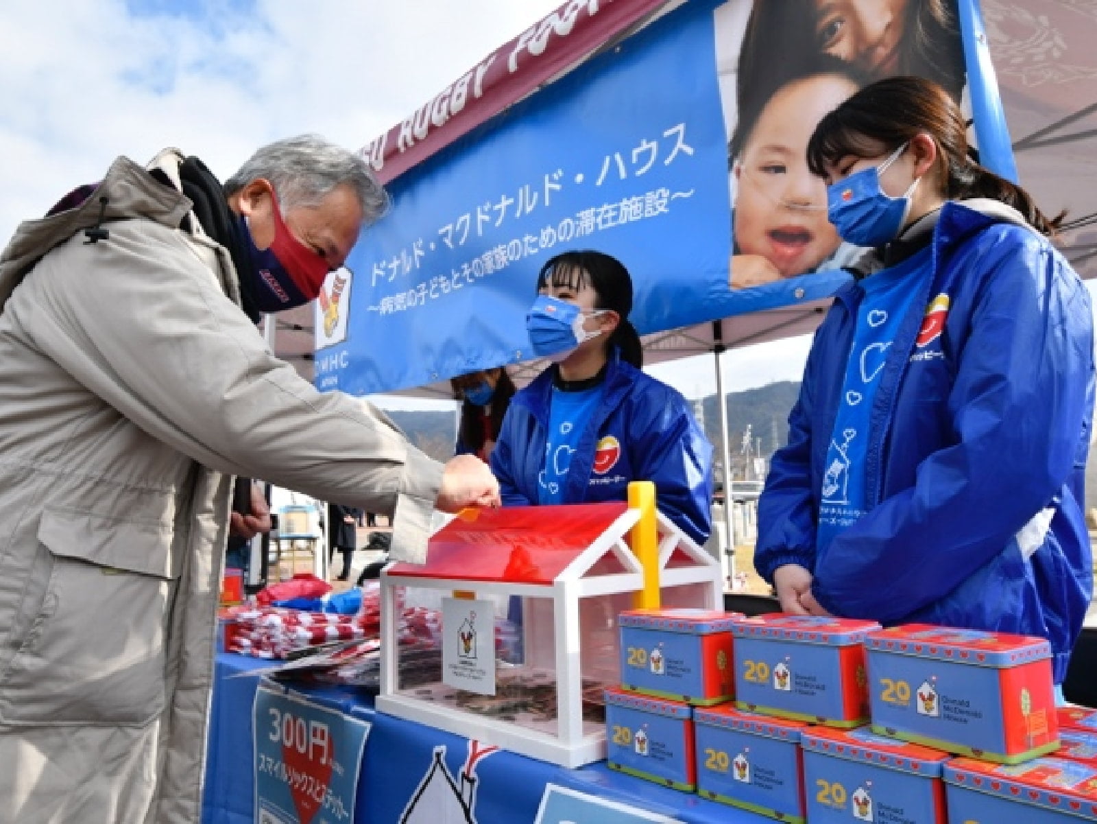 締結式は、ホーム初戦の試合開催日に実施され、ハウスを支援する募金活動も行いました。花園近鉄ライナーズ・DMHCと共に地域のマクドナルドのクルーも募金活動に協力しました。