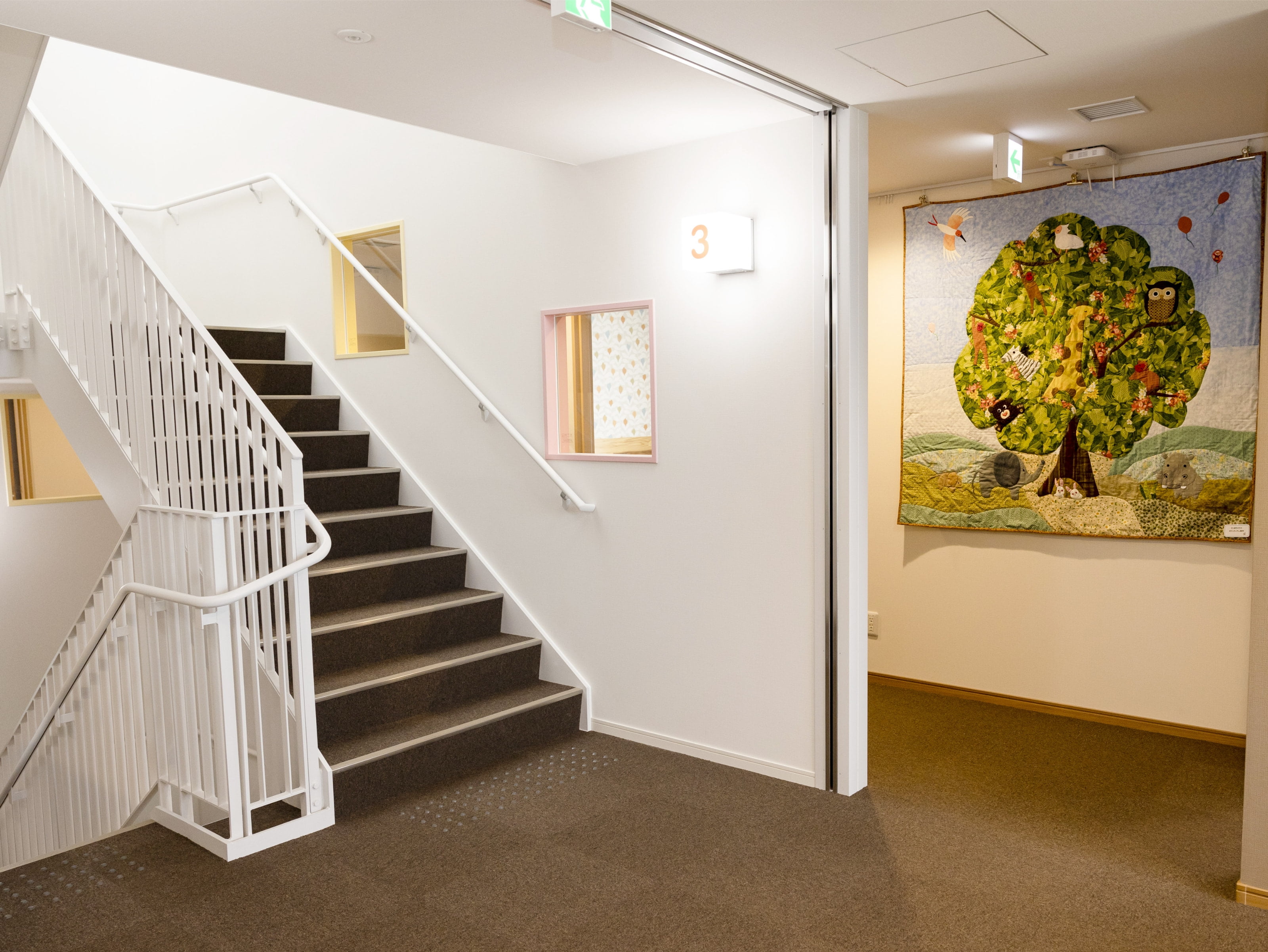 壁や柱の一部には新潟県産木材を使用し、1階のラウンジにある“感謝の樹”にはハウスの建設・運営をご支援くださった皆さんの名前が掲示されている。階段に接する壁にはカラフルな小窓がリズミカルに配置され、あらゆる場所に他のハウスから贈られた手作りの品が飾られている。