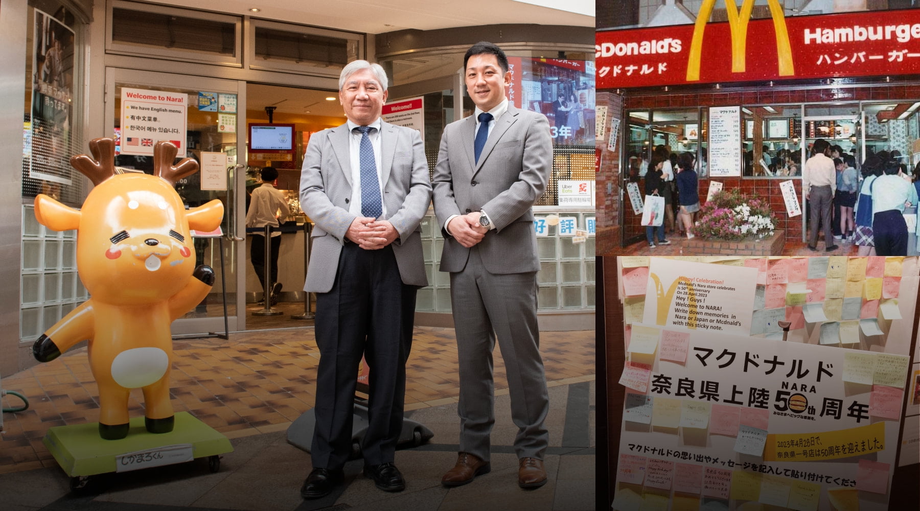 奈良県にマクドナルドを出店して、今年で50周年。スマイルストーリーでは、50年の歴史や地域の皆さまに対する想いや活動を2回にわたってお届けします。第1弾となる今回は、県内1号店であり、場所を変えることなく観光地である東向商店街で営業を続けてきた奈良店を取材。日本マクドナルドのフランチャイズ法人である有限会社アンビシャスの梶原オーナー親子による、50年への想い、未来に向けて取り組んでいる活動をお届けします。