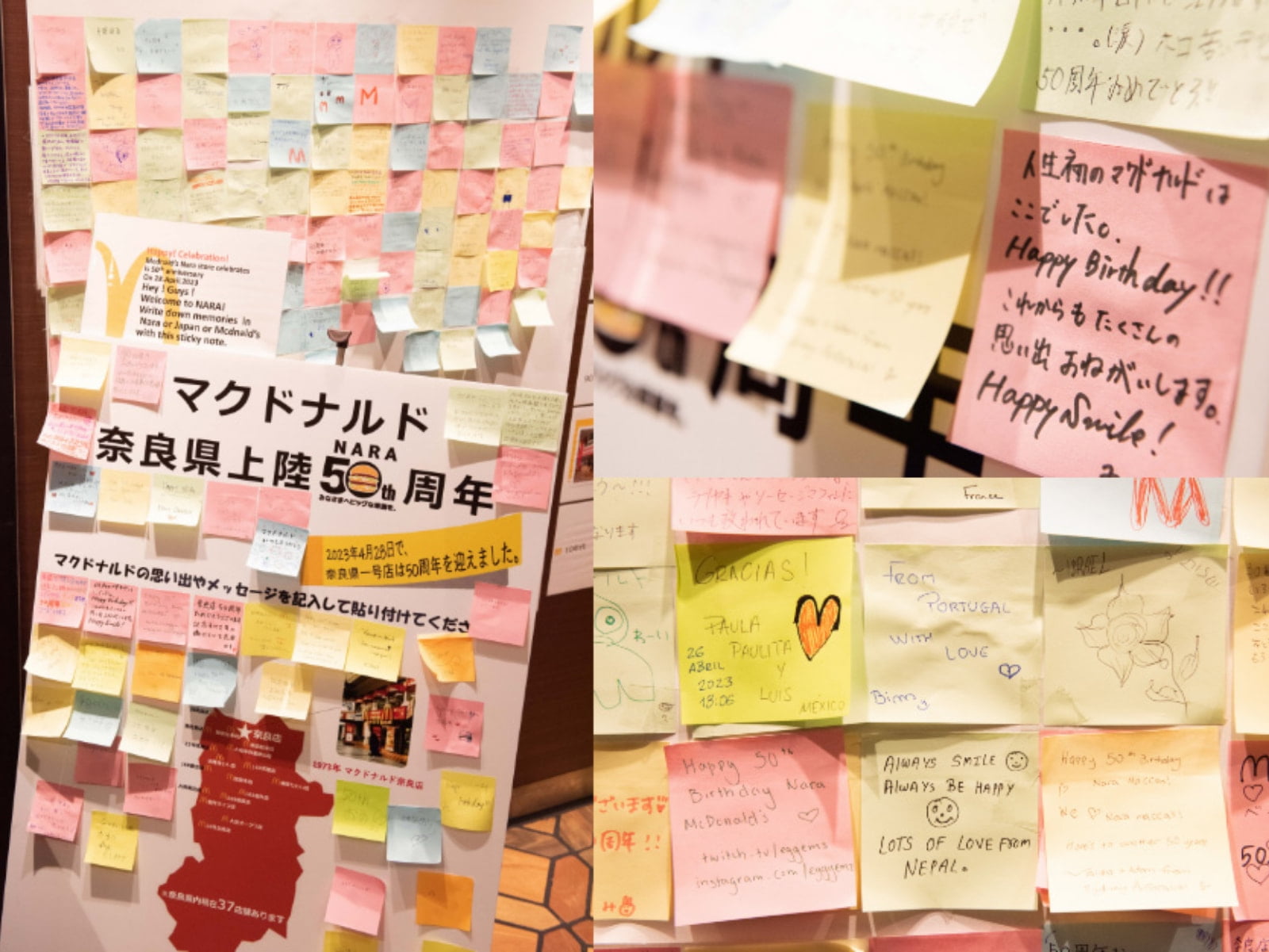 奈良市街地店舗など14店舗では、お客様の声をヒントに県内の日本マクドナルドのフランチャイズ法人6社※で協議を重ね、マクドナルドの奈良県進出50周年を記念して、お客様からメッセージをいただくボードを掲出している。
