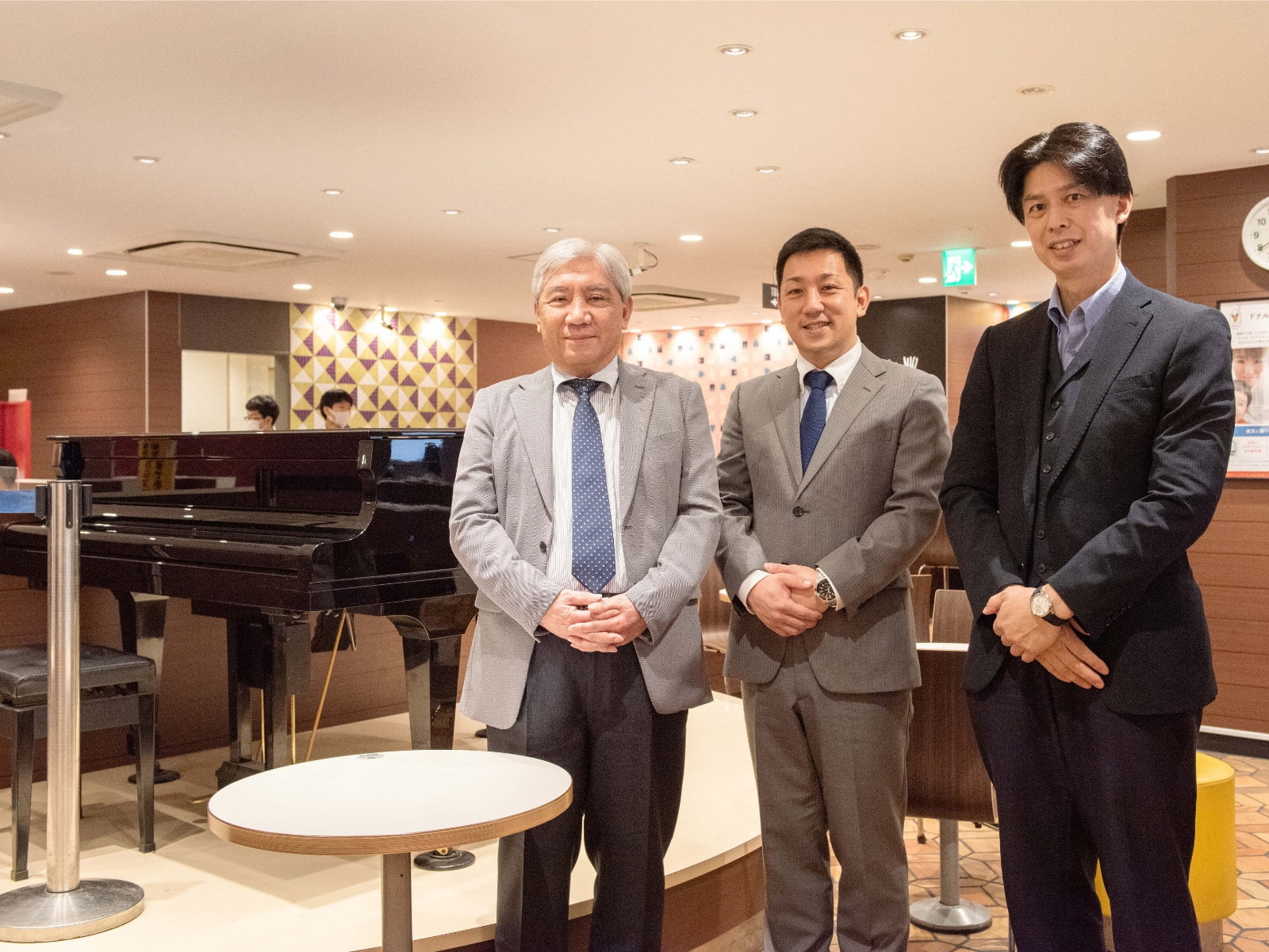 奈良店の象徴の一つであるグランドピアノと一緒に。左から、梶原オーナー、梶原取締役、50周年の企画や行政との連携などでも活躍する、西崎直オペレーションコンサルタント