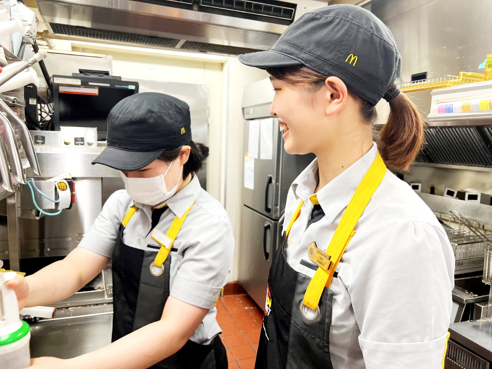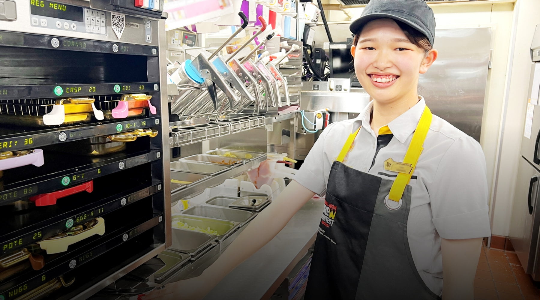 バンズにパティやソースを乗せ、ラッピングするなど、調理から商品の仕上げまでを担うポジションがアッセンブラー。丁寧さに加えてスピーディーな商品の提供も求められるが、倉田が自身のスキルアップ同様に心がけているのがお店全体が笑顔になるような雰囲気づくりだ。「クルー同士のチームワークを意識し、後輩へのトレーニングも楽しんでもらえるように心がけています。アッセンブラーはお客様と直接触れ合う機会が少ないですが、キッチンからでも仲良く明るい雰囲気は届けられます。私たちの笑顔のコミュニケーションから、お店全体を楽しい空間にしていきたいと思っています」と倉田は微笑む。