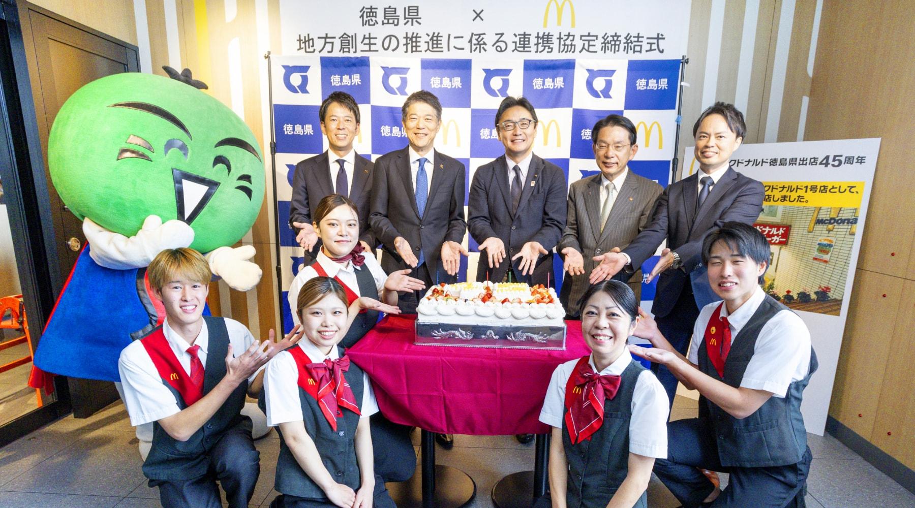 11月30日に、マクドナルド徳島川内店では、徳島県との「地方創生の推進に係る連携協定締結式」を開催。会場には、県内出店45周年を記念したアニバーサリーケーキも用意されて、会場に花を添えました。